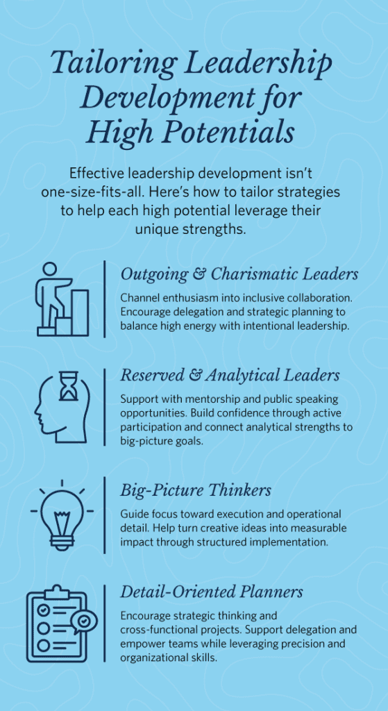 There is no single leadership profile. Some emerging leaders are naturally charismatic and thrive in high-energy environments, while others are introspective thinkers who lead through analysis and careful decision-making. The most effective development programs are tailored to individuals’ skills and challenges and will help each high potential leverage their inherent strengths and expand beyond their natural tendencies.