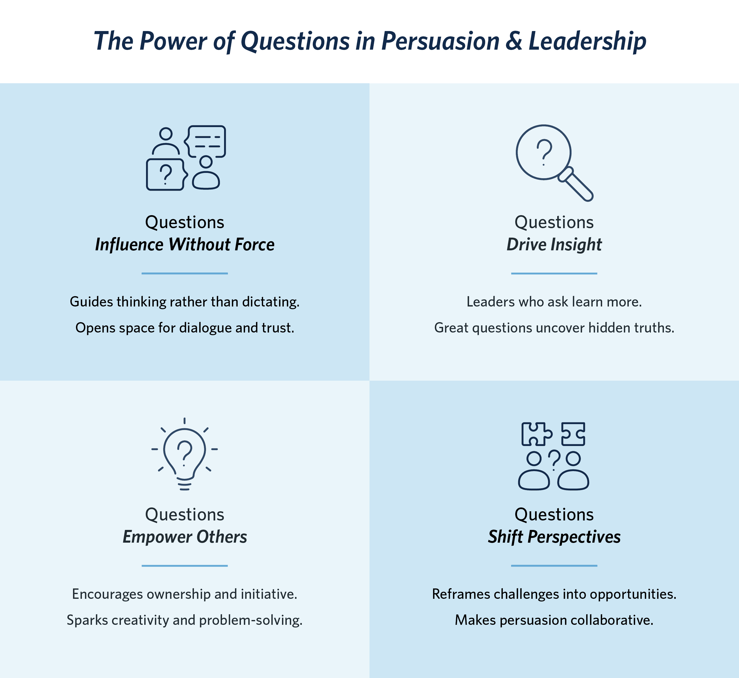Leading with questions also complements the emotional side of persuasion. As explored in our article “Pathos and Persuasion: Why Emotions Are Critical for Influencing Others”, connecting to both rational and emotional drivers helps leaders influence others in a way that resonates deeply.